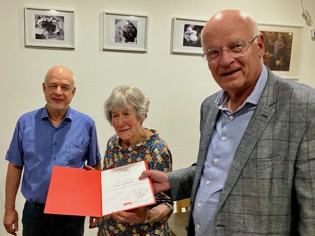 Für 50-jährige Mitgliedschaft in der SPD wurde Gita Saalmüller durch Martin Bauch geehrt und gedankt. Er stellte der Versammlung die Frage: „Welche Kommunalpolitikerin aus Süßen kam vor Jahren in der Abendschau Baden-Württemberg?“ „Es war Gita Saalmüller; sie konnte Inga in die Gemeinderatssitzung mitbringen, diese lag auf einer Decke unter dem Sitzungstisch mit ihrem Hasi.“ Das sei für die Abendschau einen kurzen Beitrag mit der fünffachen Mutter und langjährigen Gemeinderätin sowie dem jungen Bürgermeister wert gewesen, so das Vorstandsmitglied Bauch.